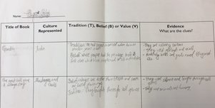 Students used a simple graphic organiser to collect and record the data. Students were asked to try and find examples of traditions, beliefs and values that may be evidenced in the story through text or pictures. Ruby's Wish had many and I recorded student ideas on the board as an example.